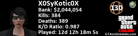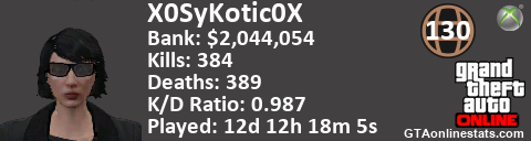 <a href="http://GTAonlinestats.com/showplayer/X0SyKotic0X"><img src="http://GTAonlinestats.com/randomsignature/X0SyKotic0X/sig.png" alt="X0SyKotic0X" border="0" /></a>