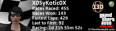 <a href="http://GTAonlinestats.com/showplayer/X0SyKotic0X"><img src="http://GTAonlinestats.com/racesignature/X0SyKotic0X/sig.png" alt="X0SyKotic0X" border="0" /></a>