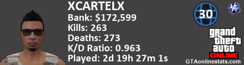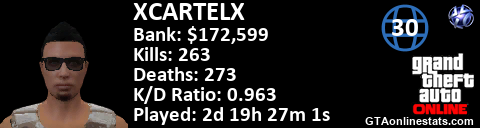 <a href="http://GTAonlinestats.com/showplayer/XCARTELX"><img src="http://GTAonlinestats.com/dmsignature/XCARTELX/sig.png" alt="XCARTELX" border="0" /></a>