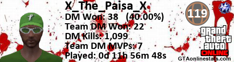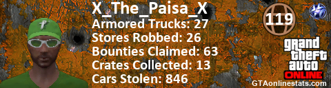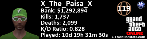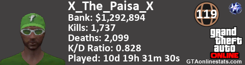 [URL=http://GTAonlinestats.com/showplayer/X_The_Paisa_X][IMG]http://GTAonlinestats.com/randomsignature/X_The_Paisa_X/sig.png[/IMG][/URL]