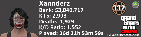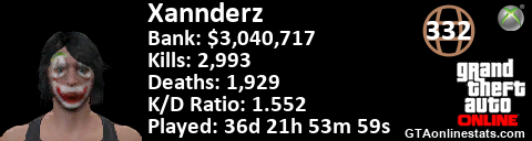 [URL=http://GTAonlinestats.com/showplayer/Xannderz][IMG]http://GTAonlinestats.com/dmsignature/Xannderz/sig.png[/IMG][/URL]