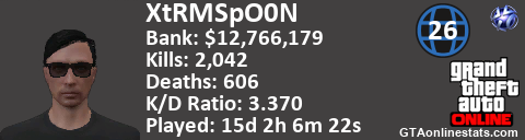 <a href="http://GTAonlinestats.com/showplayer/XtRMSpO0N"><img src="http://GTAonlinestats.com/signature/XtRMSpO0N/sig.png" alt="XtRMSpO0N" border="0" /></a>