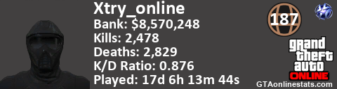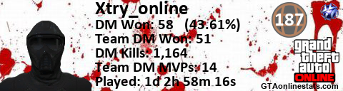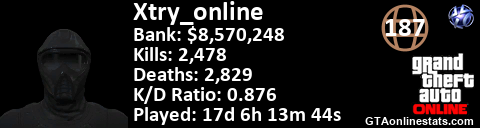 [URL=http://GTAonlinestats.com/showplayer/Xtry_online][IMG]http://GTAonlinestats.com/dmsignature/Xtry_online/sig.png[/IMG][/URL]