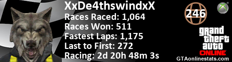 [URL=http://GTAonlinestats.com/showplayer/XxDe4thswindxX][IMG]http://GTAonlinestats.com/racesignature/XxDe4thswindxX/sig.png[/IMG][/URL]