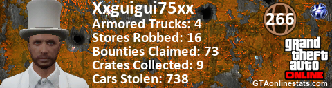 [URL=http://GTAonlinestats.com/showplayer/Xxguigui75xx][IMG]http://GTAonlinestats.com/crimesignature/Xxguigui75xx/sig.png[/IMG][/URL]