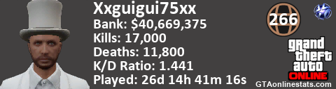 [URL=http://GTAonlinestats.com/showplayer/Xxguigui75xx][IMG]http://GTAonlinestats.com/signature/Xxguigui75xx/sig.png[/IMG][/URL]