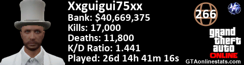 <a href="http://GTAonlinestats.com/showplayer/Xxguigui75xx"><img src="http://GTAonlinestats.com/randomsignature/Xxguigui75xx/sig.png" alt="Xxguigui75xx" border="0" /></a>