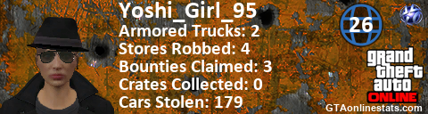[URL=http://GTAonlinestats.com/showplayer/Yoshi_Girl_95][IMG]http://GTAonlinestats.com/crimesignature/Yoshi_Girl_95/sig.png[/IMG][/URL]