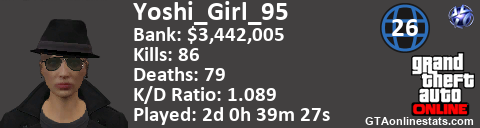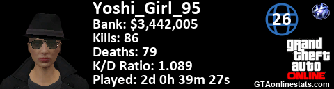 <a href="http://GTAonlinestats.com/showplayer/Yoshi_Girl_95"><img src="http://GTAonlinestats.com/signature/Yoshi_Girl_95/sig.png" alt="Yoshi_Girl_95" border="0" /></a>