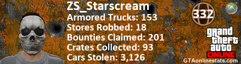 [URL=http://GTAonlinestats.com/showplayer/ZS_Starscream][IMG]http://GTAonlinestats.com/signature/ZS_Starscream/sig.png[/IMG][/URL]