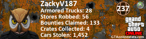 [URL=http://GTAonlinestats.com/showplayer/ZackyV187][IMG]http://GTAonlinestats.com/crimesignature/ZackyV187/sig.png[/IMG][/URL]