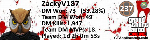 [URL=http://GTAonlinestats.com/showplayer/ZackyV187][IMG]http://GTAonlinestats.com/dmsignature/ZackyV187/sig.png[/IMG][/URL]