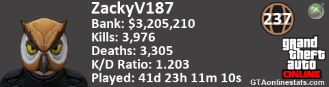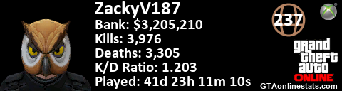 [URL=http://GTAonlinestats.com/showplayer/ZackyV187][IMG]http://GTAonlinestats.com/signature/ZackyV187/sig.png[/IMG][/URL]