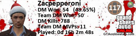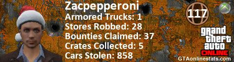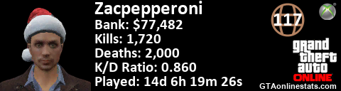 [URL=http://GTAonlinestats.com/showplayer/Zacpepperoni][IMG]http://GTAonlinestats.com/dmsignature/Zacpepperoni/sig.png[/IMG][/URL]