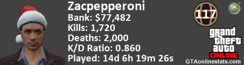 [URL=http://GTAonlinestats.com/showplayer/Zacpepperoni][IMG]http://GTAonlinestats.com/signature/Zacpepperoni/sig.png[/IMG][/URL]