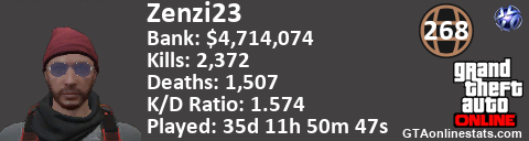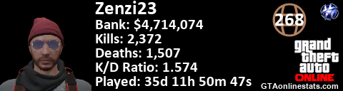 <a href="http://GTAonlinestats.com/showplayer/Zenzi23"><img src="http://GTAonlinestats.com/signature/Zenzi23/sig.png" alt="Zenzi23" border="0" /></a>