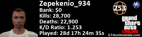 <a href="http://GTAonlinestats.com/showplayer/Zepekenio_934"><img src="http://GTAonlinestats.com/signature/Zepekenio_934/sig.png" alt="Zepekenio_934" border="0" /></a>