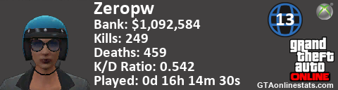 [URL=http://GTAonlinestats.com/showplayer/Zeropw/2][IMG]http://GTAonlinestats.com/signature/Zeropw/2/sig.png[/IMG][/URL]