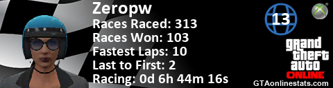 [URL=http://GTAonlinestats.com/showplayer/Zeropw/2][IMG]http://GTAonlinestats.com/racesignature/Zeropw/2/sig.png[/IMG][/URL]
