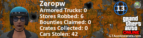 [URL=http://GTAonlinestats.com/showplayer/Zeropw/2][IMG]http://GTAonlinestats.com/crimesignature/Zeropw/2/sig.png[/IMG][/URL]