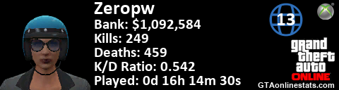<a href="http://GTAonlinestats.com/showplayer/Zeropw/2"><img src="http://GTAonlinestats.com/randomsignature/Zeropw/2/sig.png" alt="Zeropw" border="0" /></a>