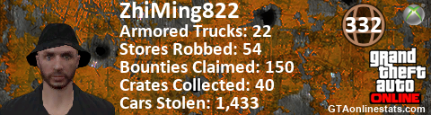 [URL=http://GTAonlinestats.com/showplayer/ZhiMing822][IMG]http://GTAonlinestats.com/crimesignature/ZhiMing822/sig.png[/IMG][/URL]