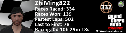 <a href="http://GTAonlinestats.com/showplayer/ZhiMing822"><img src="http://GTAonlinestats.com/racesignature/ZhiMing822/sig.png" alt="ZhiMing822" border="0" /></a>