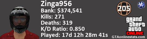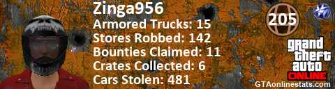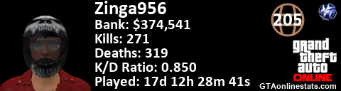 <a href="http://GTAonlinestats.com/showplayer/Zinga956"><img src="http://GTAonlinestats.com/randomsignature/Zinga956/sig.png" alt="Zinga956" border="0" /></a>