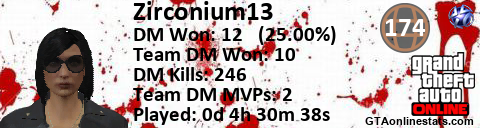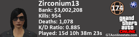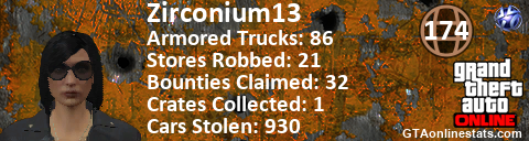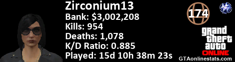 [URL=http://GTAonlinestats.com/showplayer/Zirconium13/2][IMG]http://GTAonlinestats.com/signature/Zirconium13/2/sig.png[/IMG][/URL]