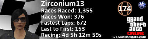 <a href="http://GTAonlinestats.com/showplayer/Zirconium13/2"><img src="http://GTAonlinestats.com/racesignature/Zirconium13/2/sig.png" alt="Zirconium13" border="0" /></a>