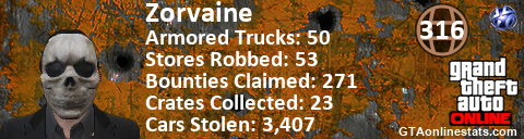 [URL=http://GTAonlinestats.com/showplayer/Zorvaine][IMG]http://GTAonlinestats.com/randomsignature/Zorvaine/sig.png[/IMG][/URL]