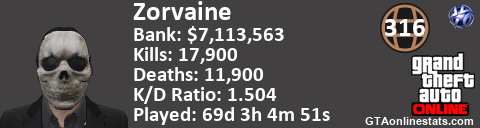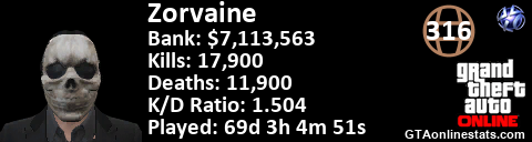 [URL=http://GTAonlinestats.com/showplayer/Zorvaine][IMG]http://GTAonlinestats.com/signature/Zorvaine/sig.png[/IMG][/URL]