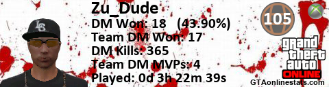 [URL=http://GTAonlinestats.com/showplayer/Zu_Dude][IMG]http://GTAonlinestats.com/dmsignature/Zu_Dude/sig.png[/IMG][/URL]