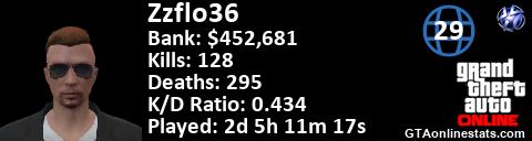 [URL=http://GTAonlinestats.com/showplayer/Zzflo36][IMG]http://GTAonlinestats.com/signature/Zzflo36/sig.png[/IMG][/URL]