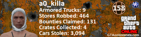 [URL=http://GTAonlinestats.com/showplayer/a0_killa/3][IMG]http://GTAonlinestats.com/crimesignature/a0_killa/3/sig.png[/IMG][/URL]