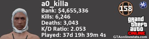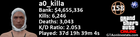 <a href="http://GTAonlinestats.com/showplayer/a0_killa/3"><img src="http://GTAonlinestats.com/greysignature/a0_killa/3/sig.png" alt="a0_killa" border="0" /></a>