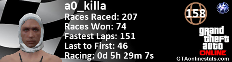 [URL=http://GTAonlinestats.com/showplayer/a0_killa/3][IMG]http://GTAonlinestats.com/racesignature/a0_killa/3/sig.png[/IMG][/URL]