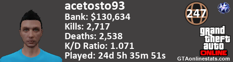 [URL=http://GTAonlinestats.com/showplayer/acetosto93][IMG]http://GTAonlinestats.com/signature/acetosto93/sig.png[/IMG][/URL]