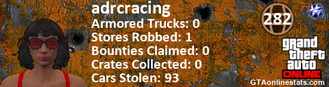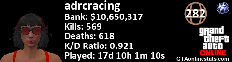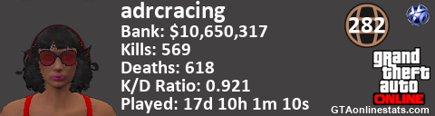 [URL=http://GTAonlinestats.com/showplayer/adrcracing][IMG]http://GTAonlinestats.com/dmsignature/adrcracing/sig.png[/IMG][/URL]