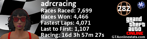 [URL=http://GTAonlinestats.com/showplayer/adrcracing][IMG]http://GTAonlinestats.com/racesignature/adrcracing/sig.png[/IMG][/URL]