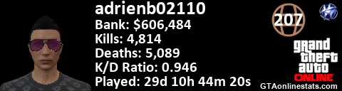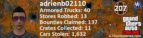 [URL=http://GTAonlinestats.com/showplayer/adrienb02110][IMG]http://GTAonlinestats.com/signature/adrienb02110/sig.png[/IMG][/URL]