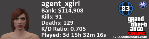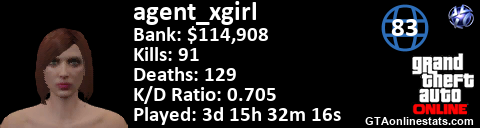 <a href="http://GTAonlinestats.com/showplayer/agent_xgirl"><img src="http://GTAonlinestats.com/randomsignature/agent_xgirl/sig.png" alt="Agent_Xgirl" border="0" /></a>