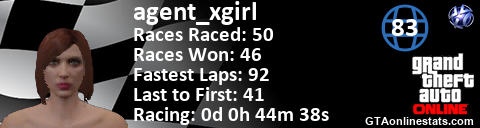 <a href="http://GTAonlinestats.com/showplayer/agent_xgirl"><img src="http://GTAonlinestats.com/racesignature/agent_xgirl/sig.png" alt="Agent_Xgirl" border="0" /></a>