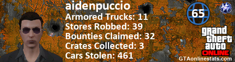 [URL=http://GTAonlinestats.com/showplayer/aidenpuccio][IMG]http://GTAonlinestats.com/crimesignature/aidenpuccio/sig.png[/IMG][/URL]
