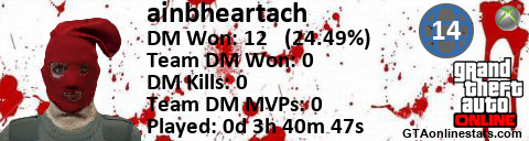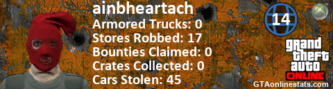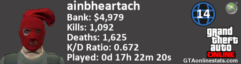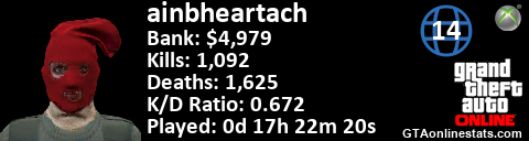 [URL=http://GTAonlinestats.com/showplayer/ainbheartach/2][IMG]http://GTAonlinestats.com/signature/ainbheartach/2/sig.png[/IMG][/URL]