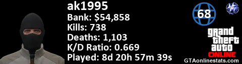 <a href="http://GTAonlinestats.com/showplayer/ak1995"><img src="http://GTAonlinestats.com/dmsignature/ak1995/sig.png" alt="ak1995" border="0" /></a>