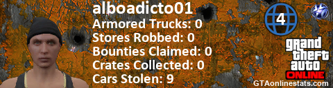 [URL=http://GTAonlinestats.com/showplayer/alboadicto01/2][IMG]http://GTAonlinestats.com/crimesignature/alboadicto01/2/sig.png[/IMG][/URL]