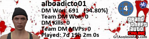 [URL=http://GTAonlinestats.com/showplayer/alboadicto01/2][IMG]http://GTAonlinestats.com/dmsignature/alboadicto01/2/sig.png[/IMG][/URL]