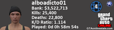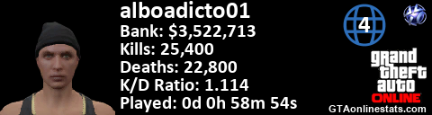 <a href="http://GTAonlinestats.com/showplayer/alboadicto01/2"><img src="http://GTAonlinestats.com/signature/alboadicto01/2/sig.png" alt="alboadicto01" border="0" /></a>