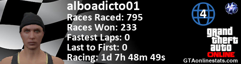 [URL=http://GTAonlinestats.com/showplayer/alboadicto01/2][IMG]http://GTAonlinestats.com/racesignature/alboadicto01/2/sig.png[/IMG][/URL]